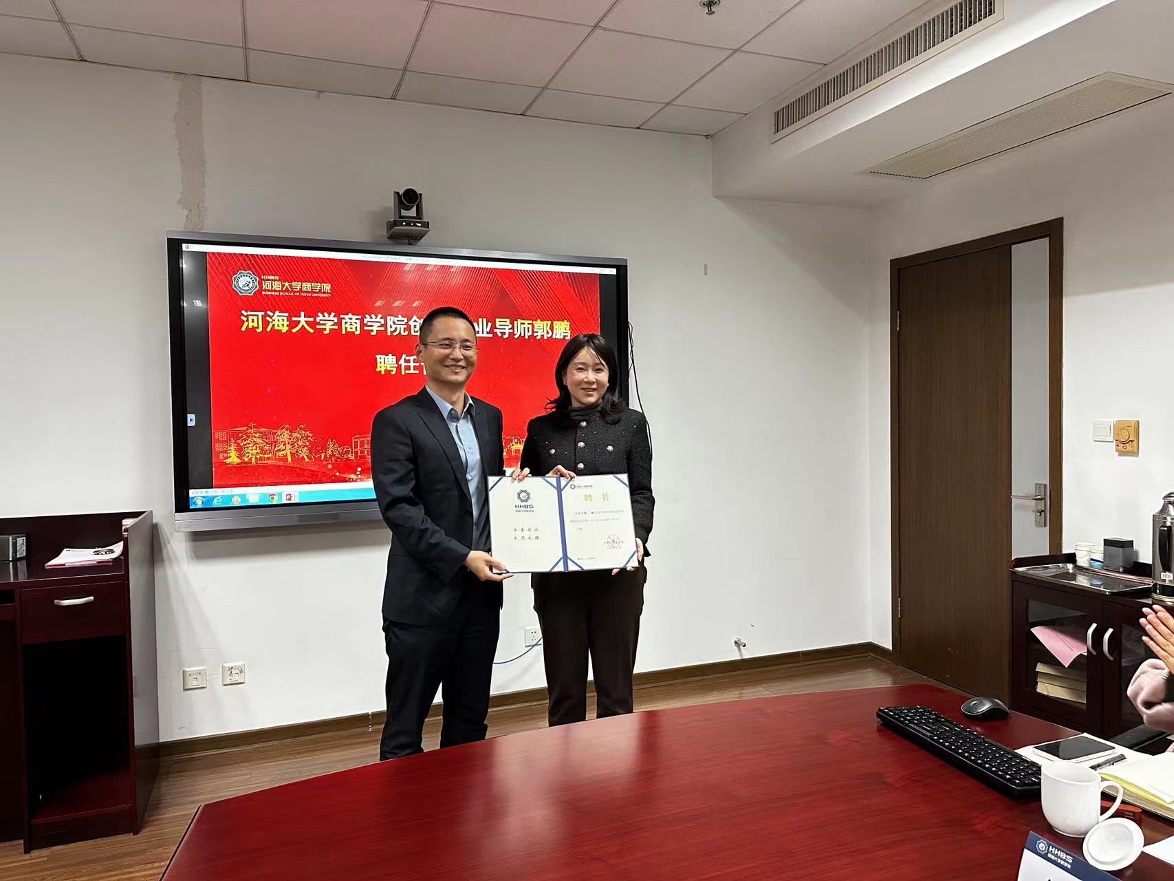 院长合作发展助理李婕为郭鹏颁发创新创业导师证书