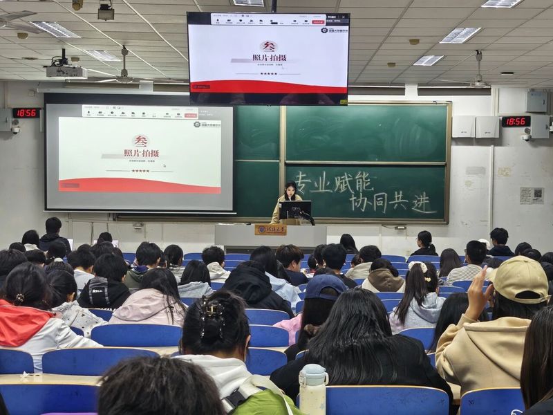 品宣部负责人傅俊颖同学分享了“照片拍摄与海报制作”的技巧。在摄影方面,她介绍了活动中的近景、中景、远景及合照的拍摄要点,以及如何正确使用构图法则,实现更好的色彩层次搭配。在海报设计环节,她通过案例的直观对比,从海报风格、文字排版、素材放置到整体布局,层层剖析。