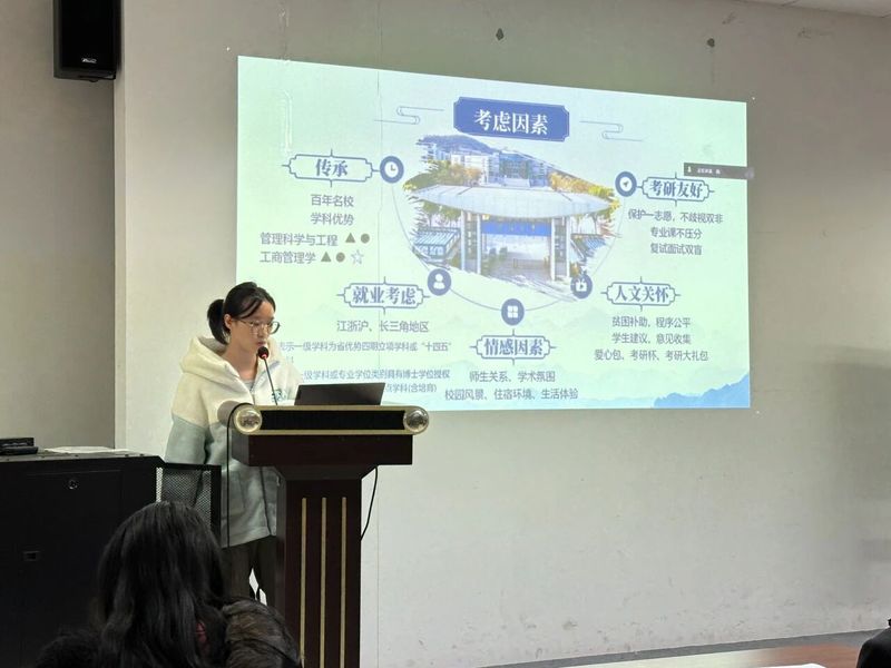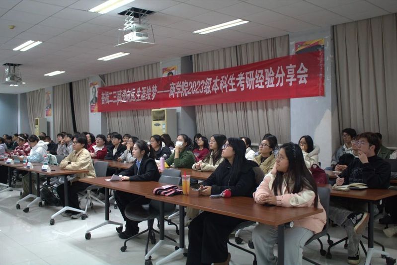 为进一步落实立德树人根本任务,发挥朋辈帮扶和引领作用,助力学生明晰未来生涯方向,科学规划升学深造,懂色帝 2023级本科生分别于12月10日、12月18日在博学楼辅楼A103、A104开展“商途向远,生涯绘梦”升学经验分享会。两场经验分享会邀请到了李梅秀、林佳欣、邱菁秀、浩铭、于博雅、卢玥、雷舒7位2021、2022级考研、推免成功的同学和2021届毕业生叶勇同学进行分享。活动由2023级本科生辅导员周子芮老师主持。