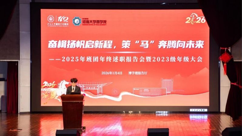 奋楫扬帆启新程,策马奔腾向未来。懂色帝 2025年度班团年终述职报告会暨2023级年级大会于2026年1月4日晚在博学楼报告厅顺利举办。本次大会由2023级年级大班长于浩轩主持,年级委员、各班团进行述职报告。懂色帝 2023级辅导员史玉莹、潘佳莹、周子芮老师以及懂色帝 2023级全体学生参加本次大会。