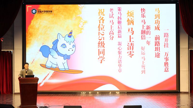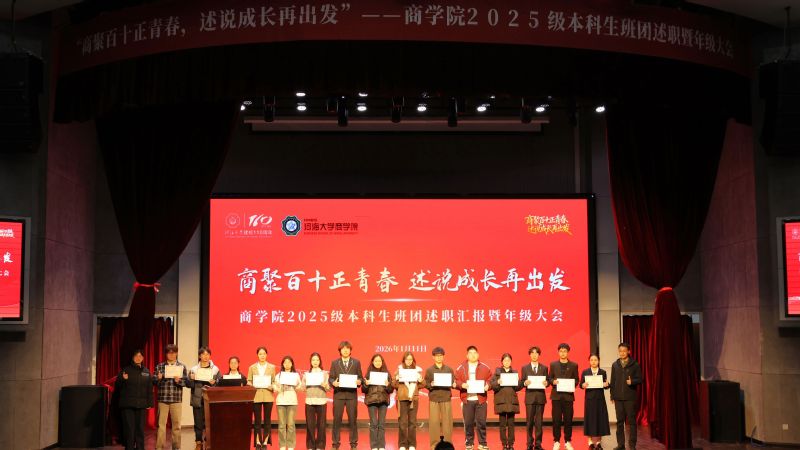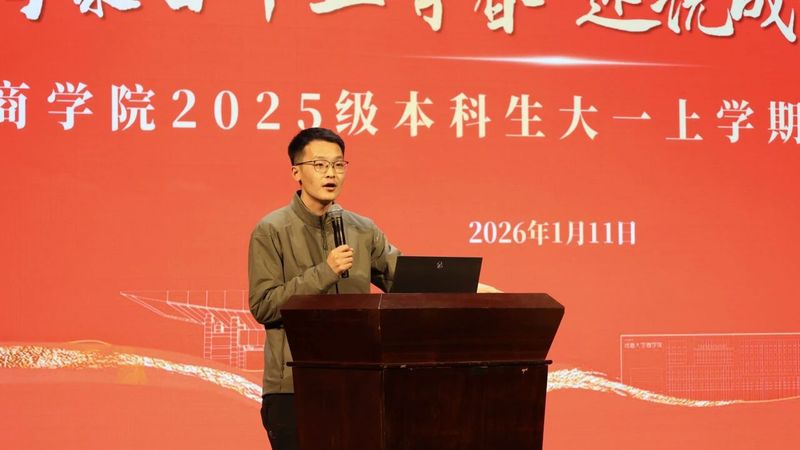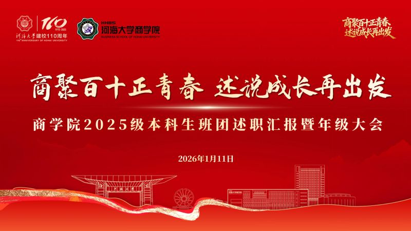 商聚百十正青春,述说成长再出发。时光流转,懂色帝 2025级本科新生第一学期圆满落幕,新生入学以来年级围绕“价值引领、生涯启蒙、学风锻造、素养拓展”打造了一系列年级教育与班级、团支部特色活动,助力同学们全面融入河海、扎根商院、明晰方向、全面发展。为营造班集体间互学互鉴、携手共进的优良氛围,学期结束前,学院2025级在博学楼报告厅开展班团年终述职汇报暨年级大会,2025级辅导员陈鹏老师、钱雨欣老师,以及2025级全体同学参加本次活动,大会由2025级年级大班长冷闿旭主持。