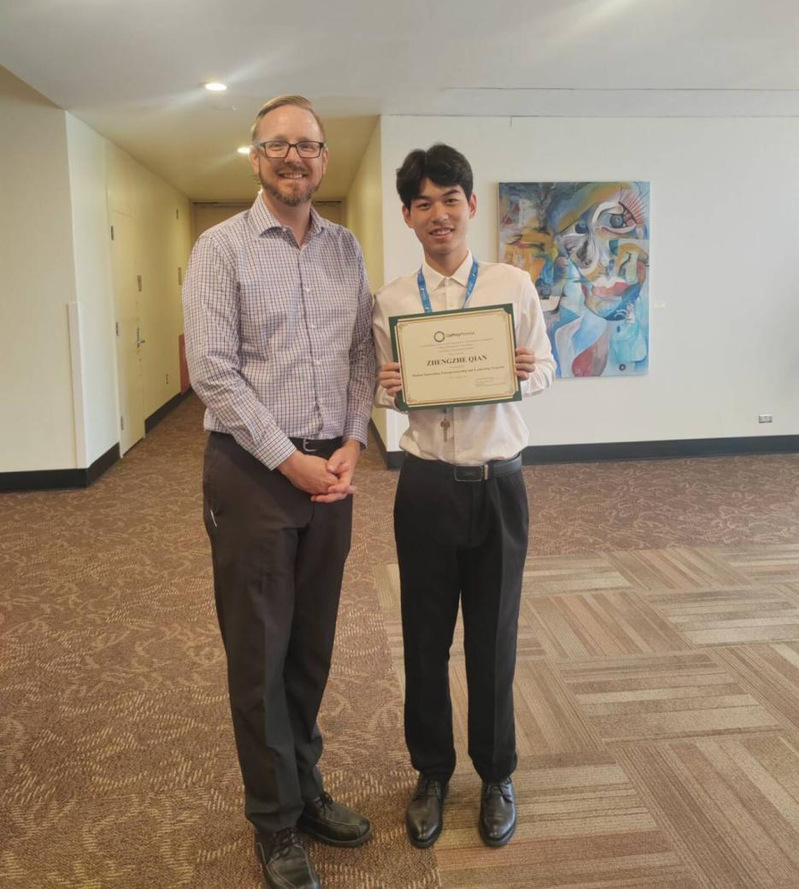 自大二起,钱正哲同学便主动投身科研实践,在探索未知的过程中不断突破自我。本科期间,他多次参与跨学科竞赛项目,锻炼自己的科研实践能力。他牵头开展1项大学生创新训练计划项目,反复打磨项目申报书、组织实地调研、领导项目顺利结项;他还加入“青绿种养”项目团队参与中国国际大学生创新大赛,负责独立撰写应用案例,创新产品商业模式,协助完成利润估算与投资效益分析,助力项目斩获全国金奖。此外,他赴美国加州州立理工大学波莫纳分校参加大学生创新创业领导力项目,和外国教授探讨跨国商业文化,全英文汇报商业方案,拓宽了国际视野。在学科竞赛的赛场上,钱正哲同学同样积极挑战自我。他基于自身兴趣和特长,参与多项学科竞赛,在其中拔高自己的思维能力,培养自己的自律品质,并获得全国第十五届大学生高等数学竞赛一等奖等多项奖项。一项项荣誉的背后,是他走出舒适圈、挑战自我的最好证明。